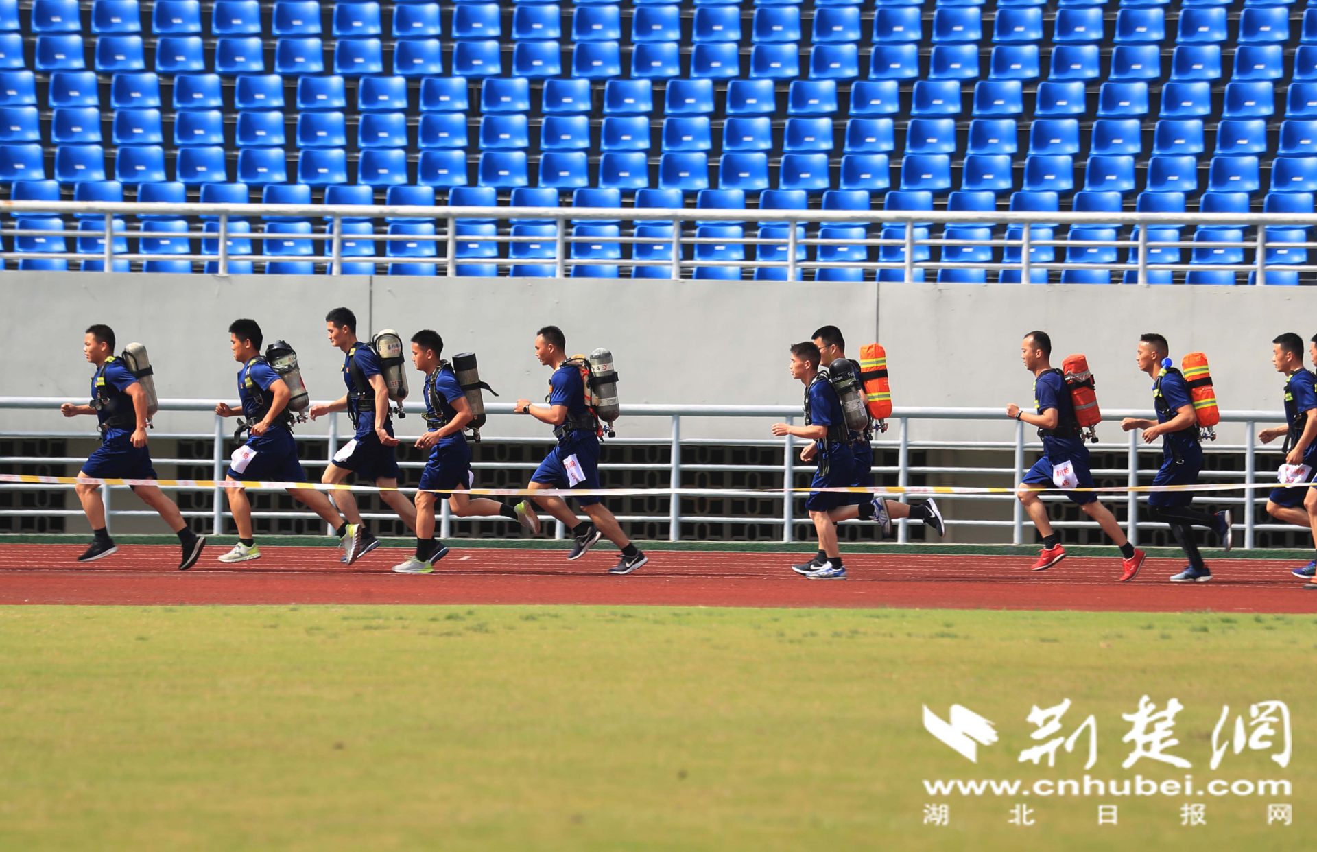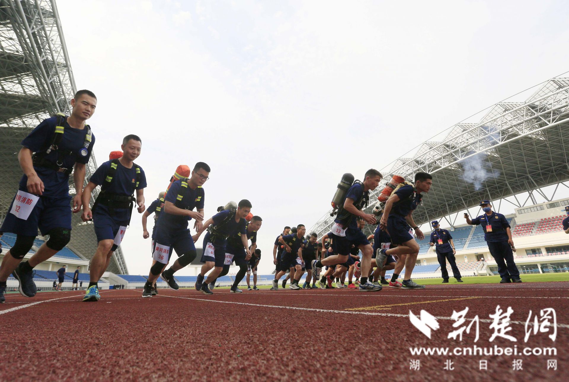 2020年5月20日,在湖北省黄冈市体育中心,消防员正在进行背负空气呼吸器5000米跑科目比拼