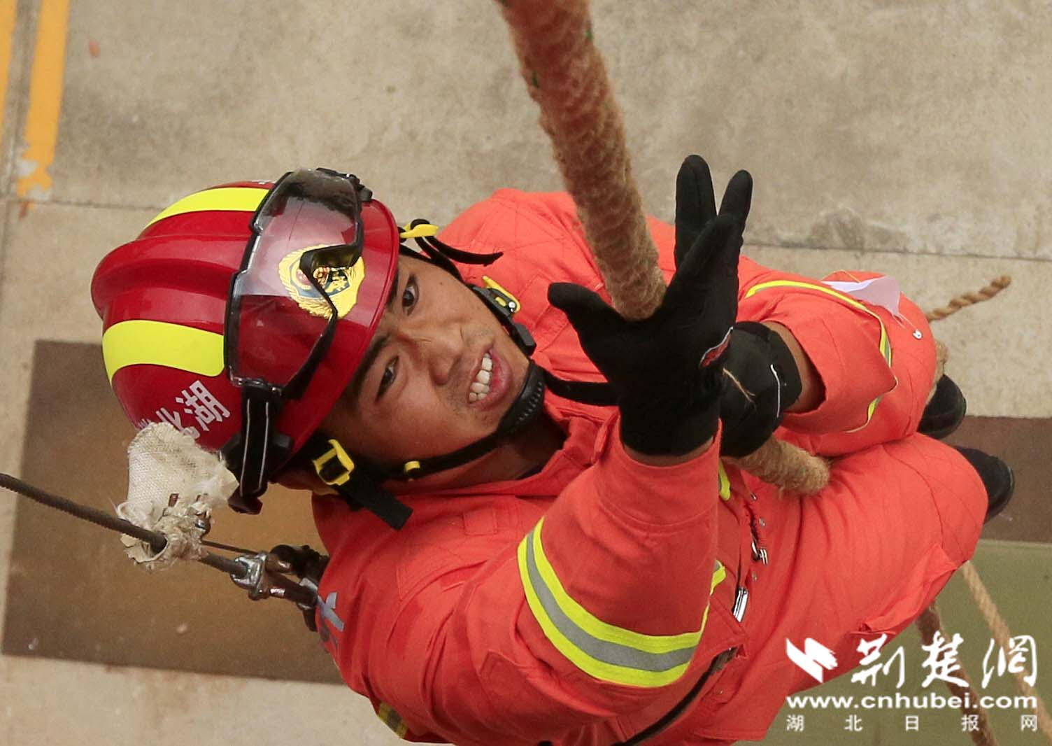 2020年5月20日,在湖北省黄冈市新港路特勤站,消防员方祥辉正在进行绳索攀爬科目比赛
