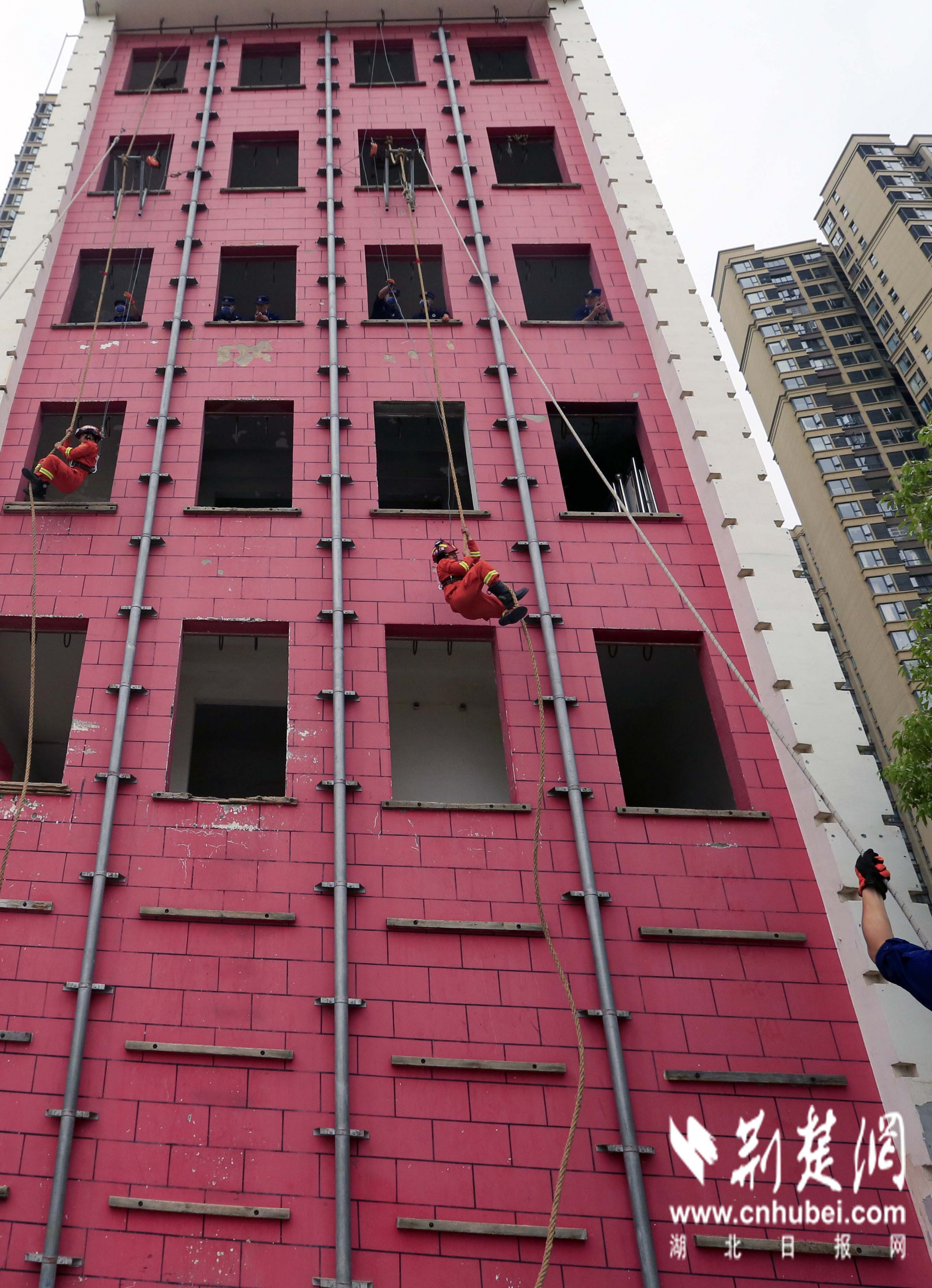 2020年5月20日,在湖北省黄冈市新港路特勤站,2名消防员正在进行绳索攀爬科目比拼