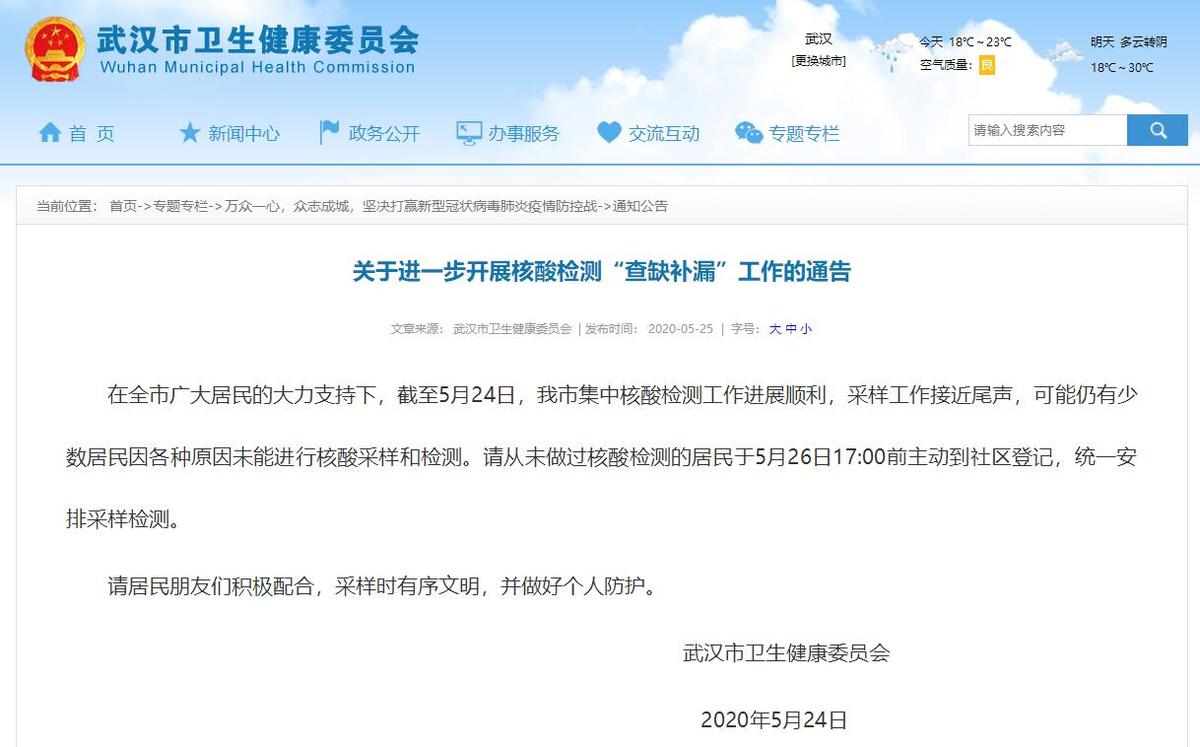 在全市广大居民的大力支持下,截至5月24日,我市集中核酸检测工作进展顺利,采样工作接近尾声,可能仍有少数居民因各种原因未能进行核酸采样和检测。请从未做过核酸检测的居民于5月26日17:00前主动到社区登记,统一安排采样检测。