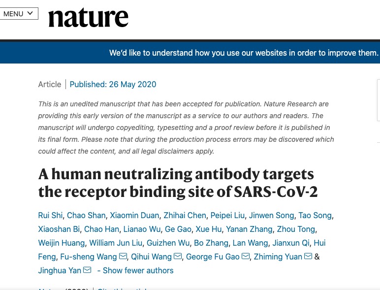 5月26日,国际权威科学期刊《自然》杂志在线发表中国科学家研究成果论文《以SARS-CoV-2受体结合位点为靶点的人类中和抗体》(A human neutralizing antibody targets the receptor binding site of SARS-CoV-2),该论文首次报告了针对SARS-CoV-2中和抗体的非人类灵长类动物实验结果,并取得了积极成果。