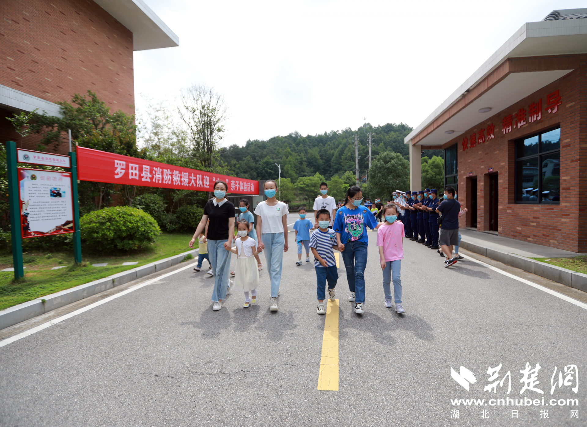 2020年5月30日,在湖北省黄冈市罗田县消防救援大队,兰又如(图右)正带领消防指战员家属体验消防队生活