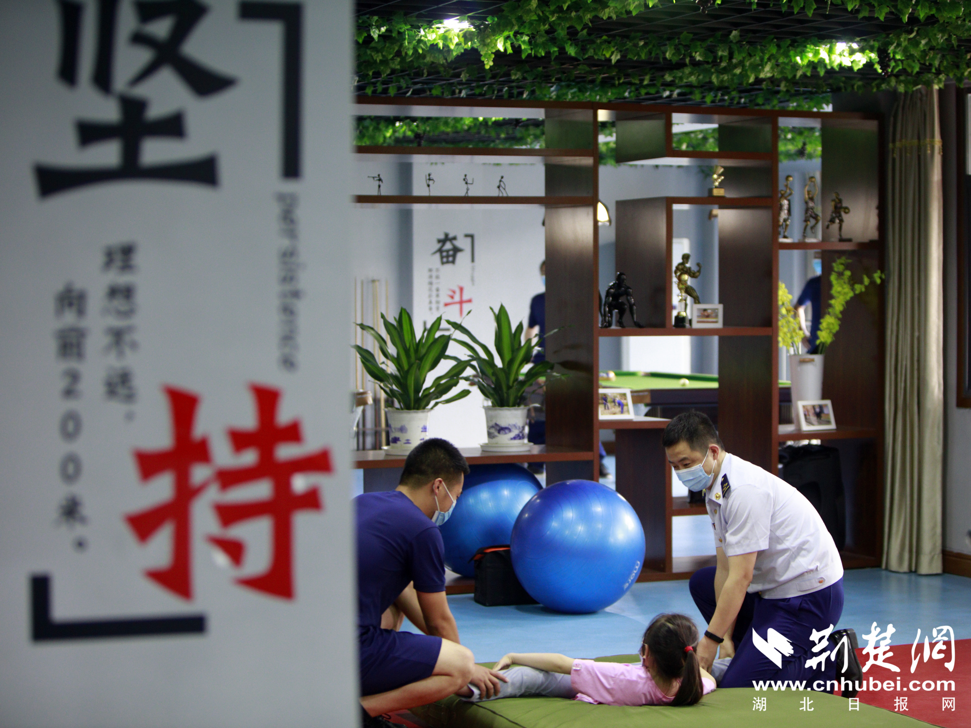 2020年5月30日,在湖北省黄冈市罗田县消防救援大队,兰又如(图二)正在进行腿部拉伸练习