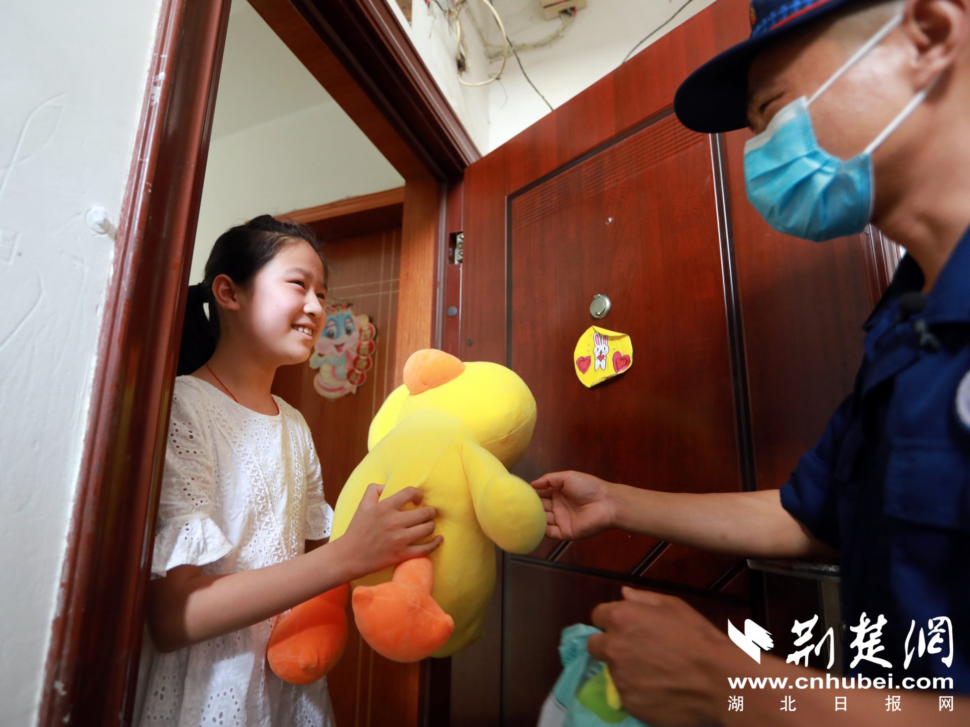 2020年6月1日,在湖北省黄冈市罗田县凤山镇欣海世纪城小区,吴梓睿(图左)开心的接过爸爸吴支伟送来的儿童节礼物