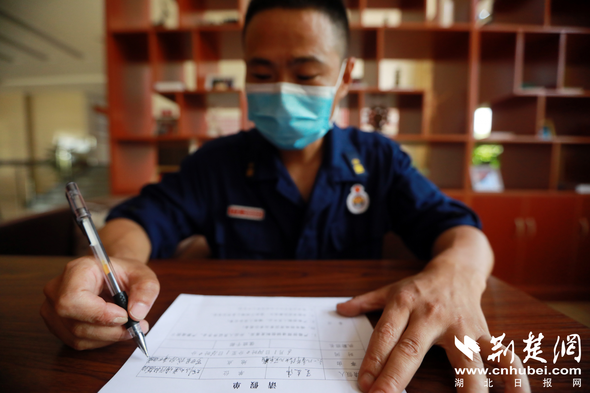 2020年6月1日,在湖北省黄冈市罗田县消防救援大队,消防员吴支伟正在填写请假条。