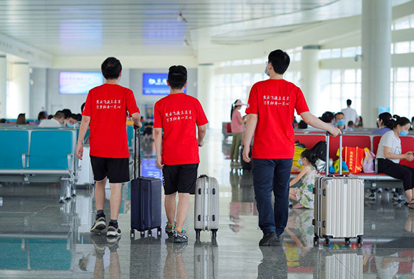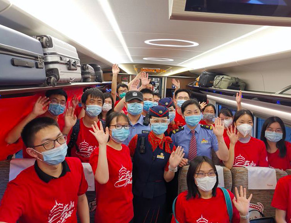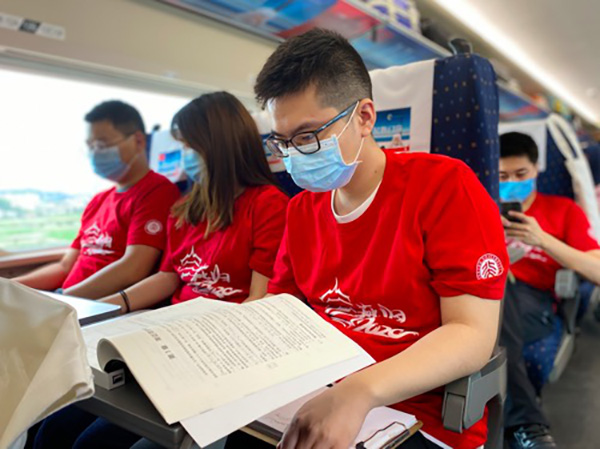 6月6日,湖北籍北大学子一起穿上红T恤,踏上返京的列车。来自湖北恩施、宜昌、天门、荆州等不同方向的学生登上前往北京的G310次高铁,另有湖北襄阳、十堰方向的学生乘坐G6814趟高铁到汉口站再后换乘G310次高铁。这些学生预计21:46分到达北京西站。