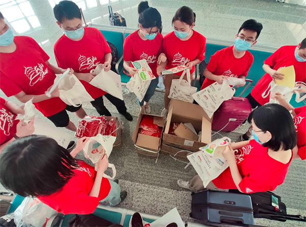 身穿老师们带去的红T恤的北大学子即将踏上返校之旅。