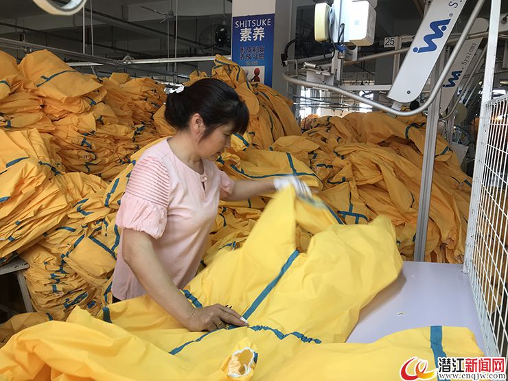 在潜江主攻户外功能服加工的中港合资企业奥瑟夫制衣有限公司内,如今一派繁忙景象。户外功能服车间里,数百名工人在流水线上有序作业;防护服车间里,鲜亮的防护服堆积如山,一旁的工人们也紧张忙碌着:压胶、贴边……