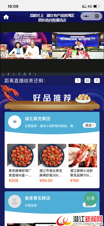 “我们秉持‘养虾先养水,好水养好虾’原则,引入汉江‘一江清水灌全市’,全面推行‘虾稻共作’生态绿色种养模式。我们还建立了‘潜江龙虾’质量追溯体系,实行日常检验检测制度,实现从生产到销售全程追溯,‘潜江龙虾’产品在部分省市抽检中合格率100%,出口欧盟135项检测指标无一项超标,被列为中欧互认免检农产品地理标志产品,是名副其实的绿色生态食品。”下午4点,潜江市副市长王绪军连麦一亩田主播和广东省茂名市电白区副区长陈伟敏,通过对“潜江龙虾”做全方位讲解,为潜江特产代言。