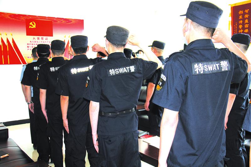 在中国共产党的生日即将来临之际,市公安局特警支队第二党支部组织党员民警开展“主题党日”活动,集体重温入党誓词,坚定理想信念,增强党性观念。图为6月12日,民警集体重温入党誓词。 (随州日报 通讯员 刘智明 尤琪 摄)
