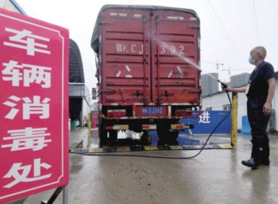 市场工作人员正在对进出车辆进行消杀。(胡文军 摄)