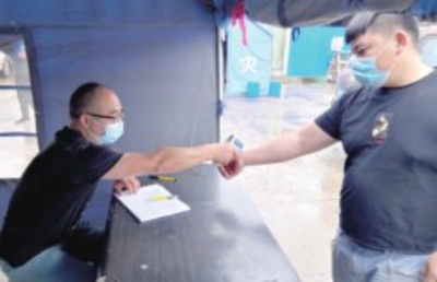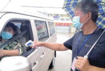工作人员对进出人员进行体温检测。(胡文军 摄)