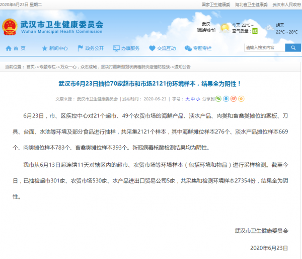 6月23日,武汉市、区疾控中心对21个超市、49个农贸市场的海鲜产品、淡水产品、肉类和畜禽类摊位的案板、刀具、台面、水池等环境及部分食品进行抽样,共采集2121个样本,其中海鲜摊位样本276个、淡水产品摊位样本669个、肉类摊位样本783个、畜禽类摊位样本393个。新冠病毒核酸检测结果均为阴性。