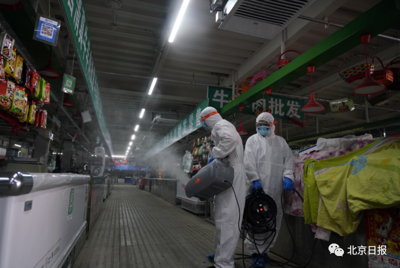 6月19日,北京大兴区万源吉庆农副产品市场,工作人员在对市场环境进行全面消杀。