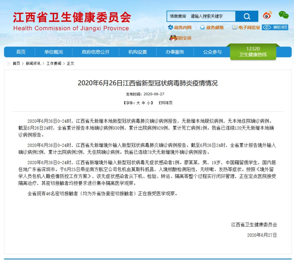 2020年6月26日0-24时,江西省新增境外输入新型冠状病毒无症状感染者1例。廖某某,男,19岁,中国籍留俄学生,国内居住地广东省深圳市。于6月25日乘坐南方航空公司包机由莫斯科抵昌,入境核酸检测阳性,无咳嗽、发热等症状。按照《境外留学人员包机入赣疫情防控工作方案》,该无症状感染者从下机、检验、转运、隔离等整个过程实行闭环管理,正在定点医院接受隔离治疗,其密切接触者均按要求进行集中隔离医学观察。