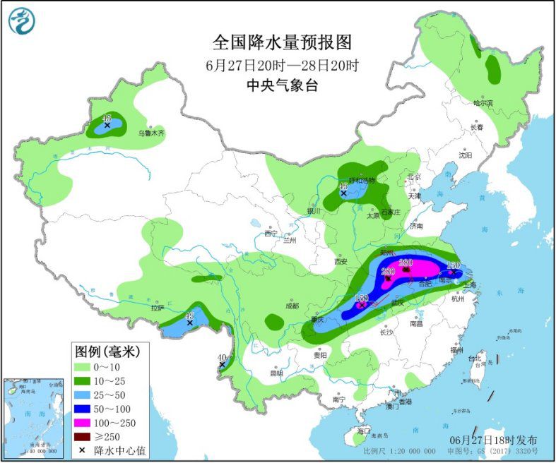 预计,6月27日20时至28日20时,重庆东南部、贵州东北部、湖南西北部、湖北大部、河南中南部、安徽中北部、江苏中南部、上海等地有大到暴雨,其中,河南东南部、湖北北部和西南部、湖南西北部、安徽中北部、江苏南部等地的部分地区有大暴雨,局地特大暴雨(250~280毫米)。上述部分地区伴有短时强降水(最大小时降雨量30~50毫米,局地可超过70毫米),局地有雷暴大风等强对流天气。中央气象台6月27日18时继续发布暴雨黄色预警。