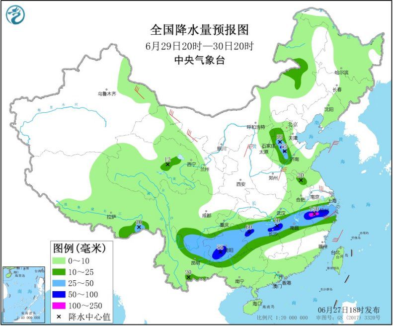 6月29日20时至30日20时,江南中北部、贵州、四川南部、云南东北部和南部、广西北部以及河北中南部等地有中到大雨,其中,贵州西南部、湖南中部、江西北部、安徽南部、浙江中西部、河北南部等地局地有暴雨或大暴雨(50~150毫米);新疆东部、内蒙古西部、陕西北部、河南、江苏东部沿海等地的部分地区有4~6级风。