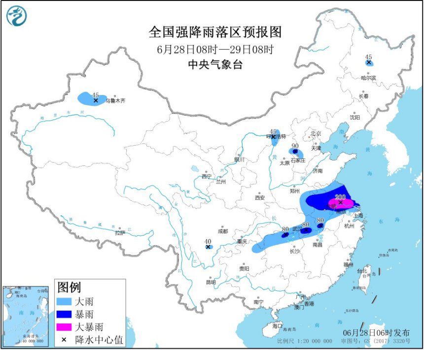 预计,6月28日08时至29日08时,贵州东北部、湖南北部、湖北东部、河南东南部、安徽大部、江苏大部、上海等地有大到暴雨,其中,安徽东部、江苏中南部等地的部分地区有大暴雨(100~200毫米)。上述部分地区伴有短时强降水(最大小时降雨量30~50毫米,局地可超过70毫米),局地有雷暴大风等强对流天气。
