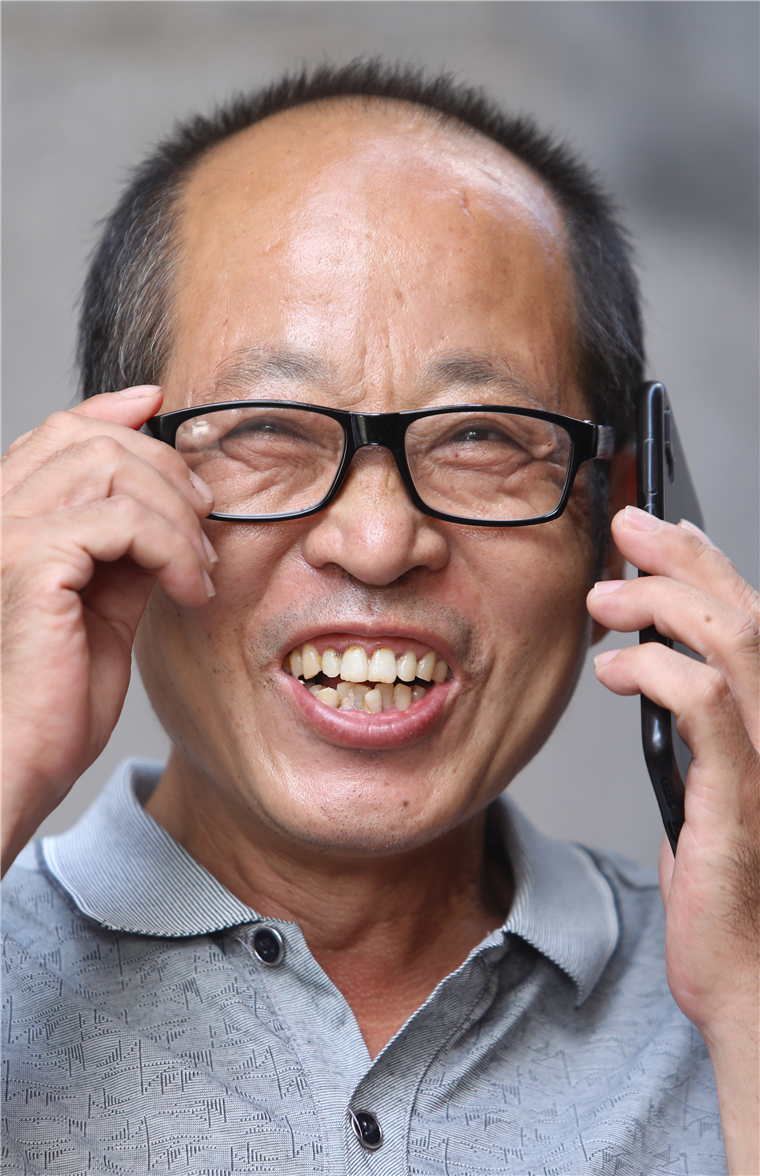 6月27日,吴桂春在接受媒体电话采访时,聊到自己的新工作有了着落、重新办好了东莞图书馆的读者证,又可以在工作之余回到图书馆看书时流露出了幸福的笑容 记者 郑志波 摄