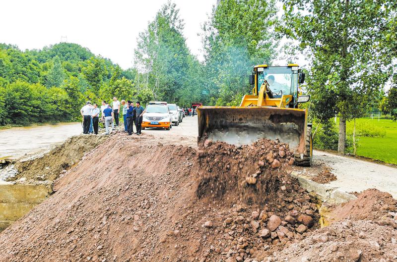 6月27日至28日,强降雨天气导致随州市多地出现山体滑坡阻塞交通和水毁道路现象。图为牛程公路随县殷店镇江头店村水毁路段抢修现场。副市长吴超明深入各公路受灾现场查看灾情,指导灾后修复工作。(随州日报全媒记者李文军摄)