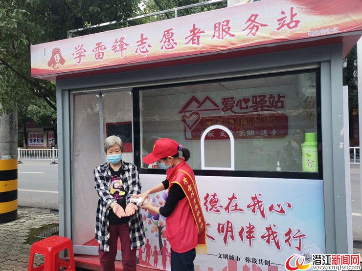 在位于章华中路的学雷锋志愿服务岗亭边,志愿者张蓉正为前来咨询问题的市民提供帮助。