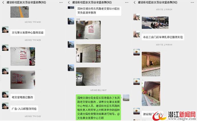 在有近百名成员的建设街社区创文百日攻坚微信群,大家正如火如荼交流着巡查问题的整改情况。