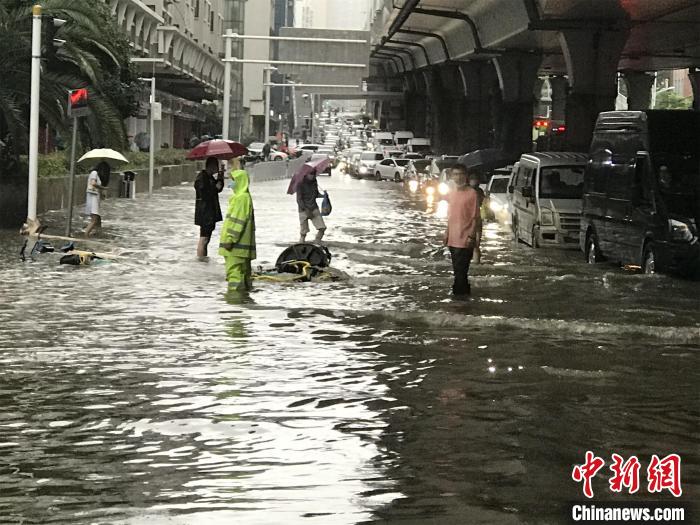 7月6日,武汉市洪山区雄楚大道珞雄路口,水务人员正在加紧排水 裴春梅 摄