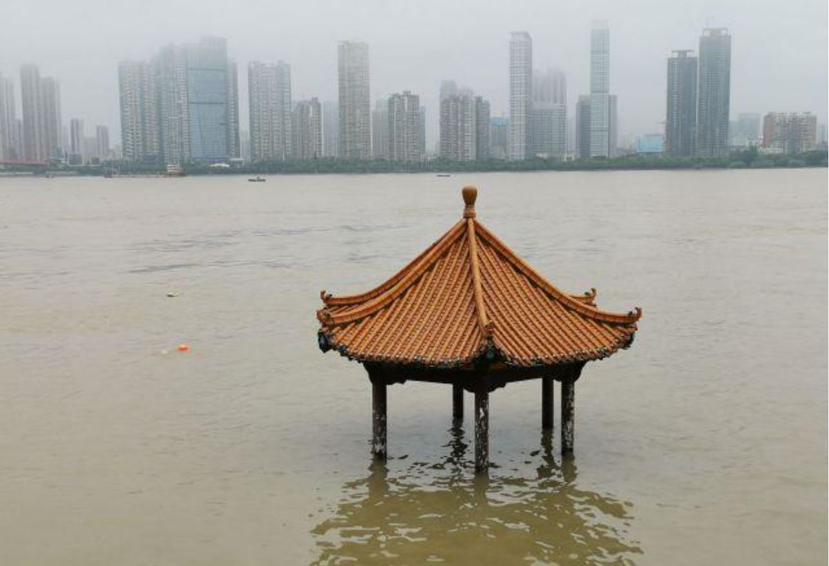图为7月4日武汉武昌江边黄花叽亲水凉亭,长江洪水已漫上亲水平台,长江武汉段水位超设防1米,凉亭孤鹜的矗立在滚滚洪流中。