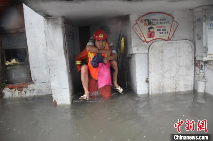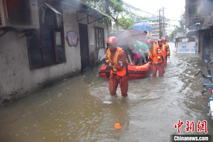 消防救援人员利用救生艇及相关救援器材展开施救。救援过程中,由于小区路面渍水较深、路况不明,且有大量杂物漂浮,为防止发生安全事故,多名消防员在大雨中徒步趟水,采取牵渡等方式,将小区居民转移到救生艇,疏散至安全区域。