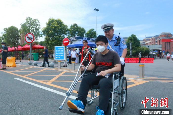 民警帮助行动不便考生进入考点 王飞 摄