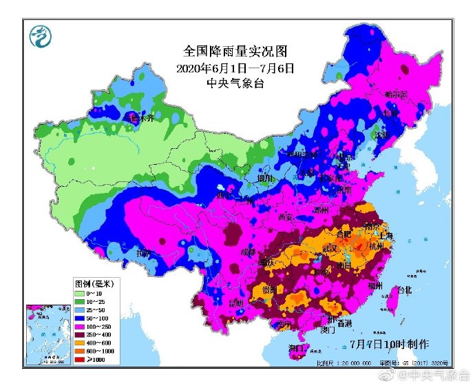 @中央气象台 7月7日消息,一张图看6月1日以来的降雨。安徽安庆和黄山、湖北黄山等局地累计降雨量突破1200毫米!有网友问今年的强降雨与1998年对比情况,目前统计来看,今年6月1日至7月6日期间,长江流域的累计降雨量为近60年以来第2高,第1高为2016年,第3高为1998年。但如果按照6-8月3个月的降雨量历史统计来看,98年的记录仍是历年最高。
