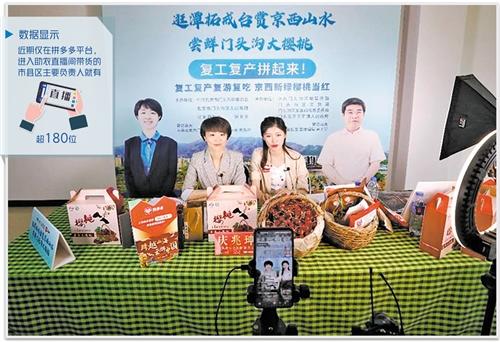 北京市门头沟区委常委、副区长庆兆珅(前左)在直播时,向消费者介绍门头沟樱桃的特点。 (受访者供图)