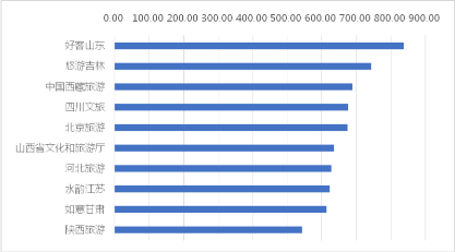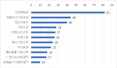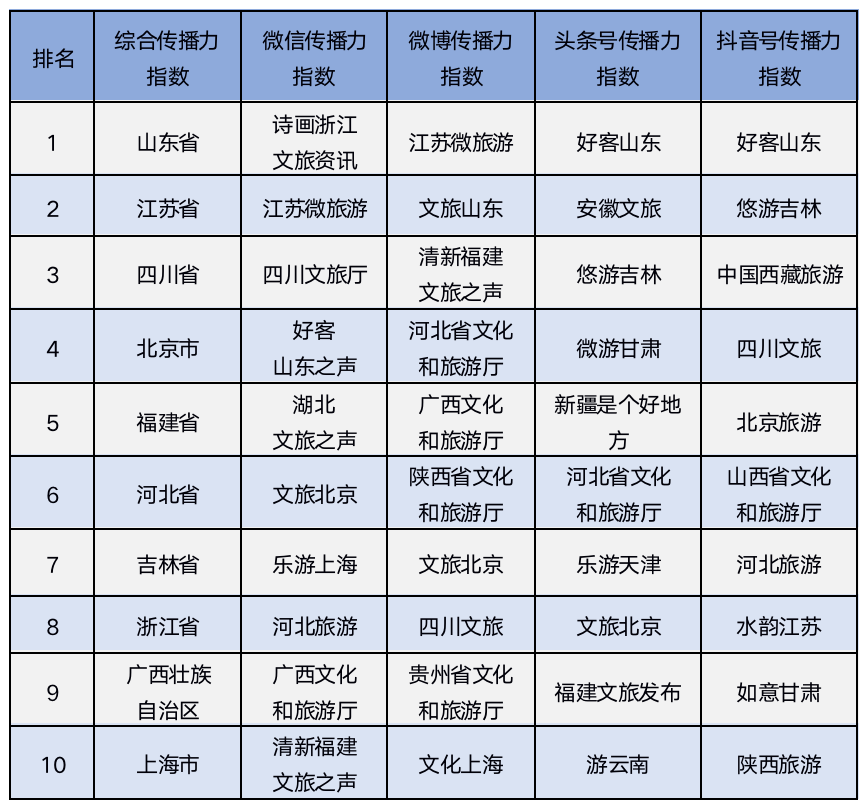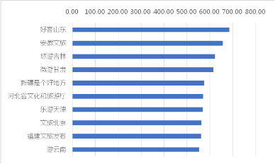 从2020年6月全国各省级地区新浪微博账号的传播力指数来看,TOP10排序为江苏微旅游、文旅山东、清新福建文旅之声、河北省文化和旅游厅、广西文化和旅游厅、陕西省文化和旅游厅、文旅北京、四川文旅、贵州省文化和旅游厅、文化上海。