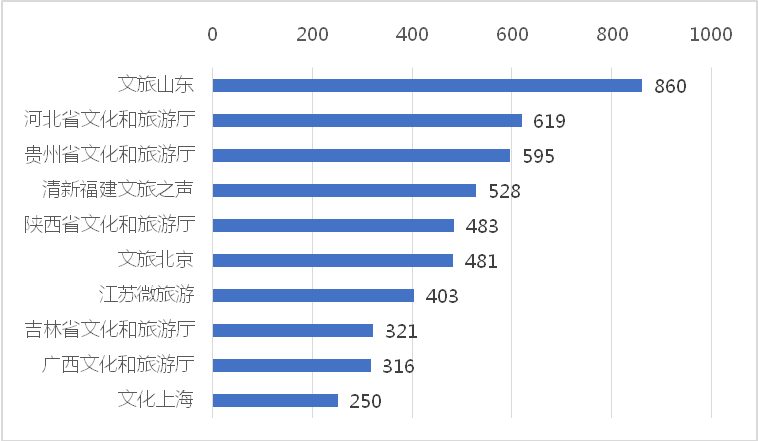 从原创微博发文数来看,最高的是“文旅山东”,为860条;其次是“河北省文化和旅游厅”,为619条;第三是“贵州省文化和旅游厅”,为595条。而排在末位的“宁夏旅游”和“辽宁省文化和旅游厅”分别只有6条。