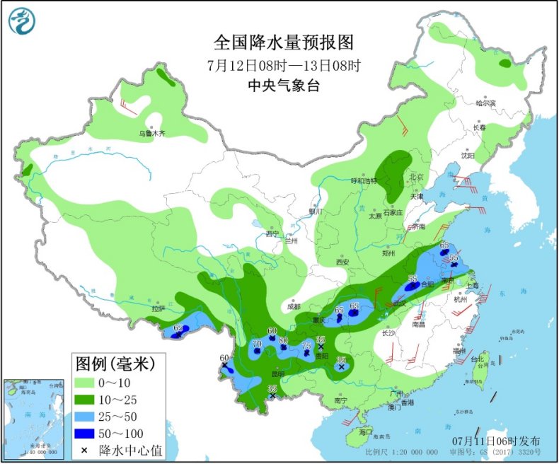 7月11日08时至12日08时,西藏东部、西北地区东部、华北中西部、黄淮、江淮大部、江汉大部、西南地区东部和南部、广西东北部等地的部分地区有中到大雨,其中,西藏东南部、陕西南部、河南南部、安徽中北部、江苏中北部、湖北西南部和东北部、重庆东北部、云南东北部等地的部分地区有暴雨或大暴雨(100~180毫米)。内蒙古东部、新疆沿天山地区等地的部分地区有4~5级风。
