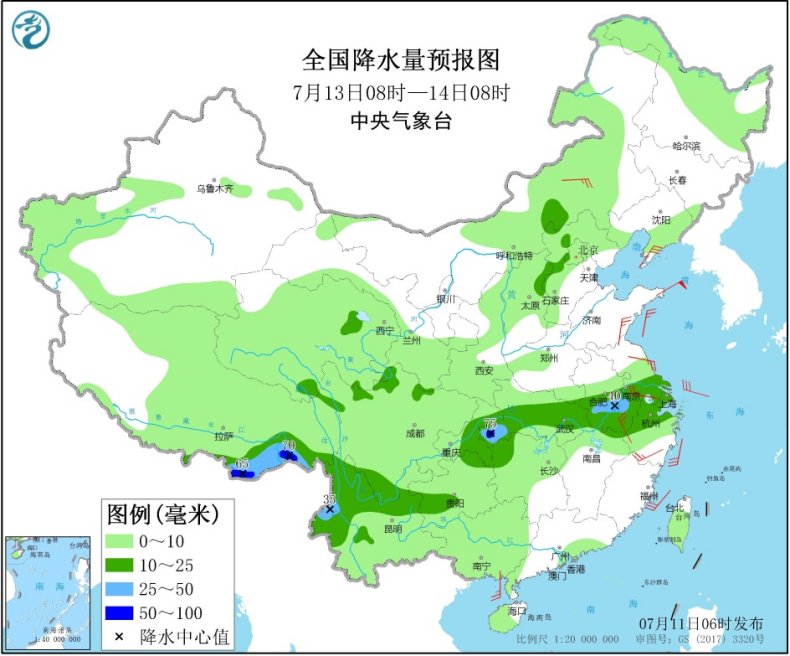 7月13日08时至14日08时,内蒙古中部、西藏东南部、江淮、江汉东部、江南北部、重庆、云南北部等地的部分地区有中到大雨,其中,西藏东南部、湖北西南部等地的部分地区有暴雨(50~75毫米)。内蒙古中部、辽东半岛、黄淮东部、江淮东部、浙江等地的部分地区有4~6级风。