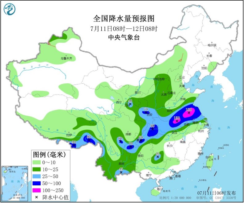 11日08时至12日08时,四川南部、重庆、陕西南部、甘肃东部以及湖南西北部、湖北大部、河南中南部、安徽中北部、江苏大部等地的部分地区有大到暴雨,其中,河南东南部、安徽北部、江苏西北部等地局地有大暴雨(100~180毫米);上述部分地区伴有短时强降水(最大小时降雨量30~50毫米,局地可超过70毫米),局地有雷暴大风等强对流天气。中央气象台7月11日06时继续发布暴雨黄色预警)。