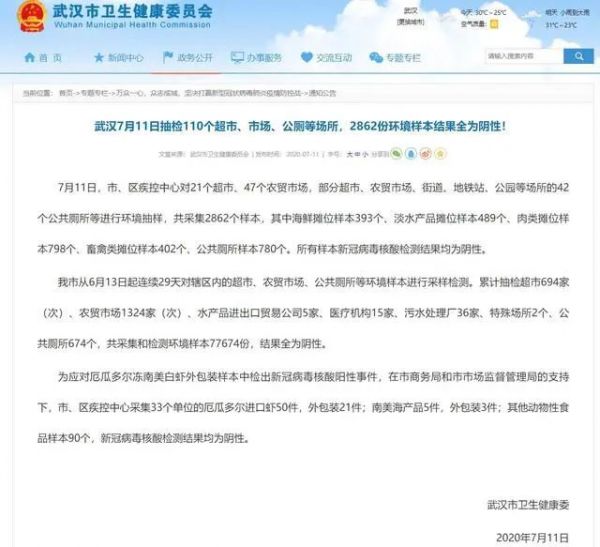 7月11日,市、区疾控中心对21个超市、47个农贸市场,部分超市、农贸市场、街道、地铁站、公园等场所的42个公共厕所等进行环境抽样,共采集2862个样本,其中海鲜摊位样本393个、淡水产品摊位样本489个、肉类摊位样本798个、畜禽类摊位样本402个、公共厕所样本780个。所有样本新冠病毒核酸检测结果均为阴性。
