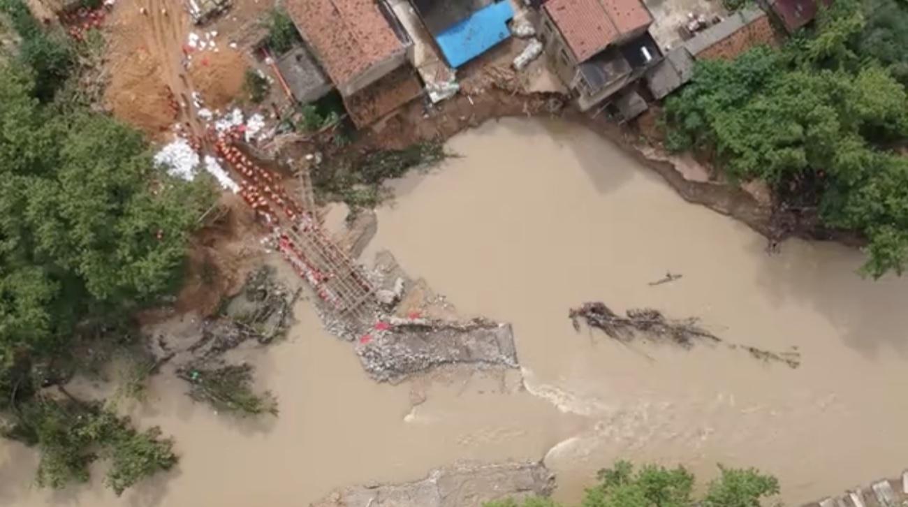 多日连续暴雨,黄梅县成了湖北省受灾最严重的地区之一。县内一座拦河堰彻底被冲毁,形成近百米的半圆形溃口,民房受损严重,群众出行受阻。
