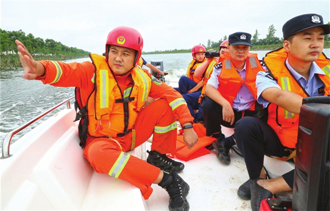自15日零时起,杨林尾镇电排河彭杨公路段实行交通管制,全段禁止停放除防汛抢险和防汛工作车外的一切车辆,确保应急抢险通道畅通和道路交通安全。图为民警、消防救援队员乘快艇向两岸垂钓者喊话,进行劝离。 摄影 记者 刘贤双