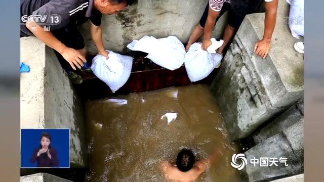 这是江西九江,长江水位超警戒线,柴桑区新洲垦殖场长江堤坝,危机时刻,应急抢险突击队员扎进水中将排水口堵住。
