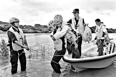 船停在离岸边还有一段距离的地方,消防战士在水中把熊利红背了起来,送到岸上