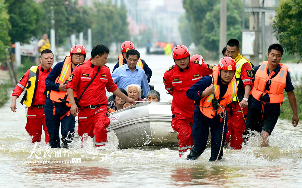 受连续强降雨影响,7月19日上游洪水漫过河堤,将该镇镇区淹没,镇区积水最深处达3米,街道群众被困水中。相关部门紧急调动救援力量,解救被困群众,并将受灾群众妥善安置。陈力/人民图片