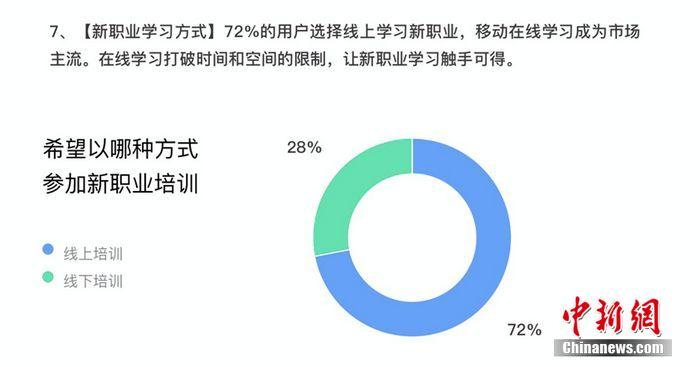 《报告》显示,在新职业学习方式的选择上,72%的用户选择线上学习新职业。移动在线学习打破了时间和空间的限制,为用户提供了更加灵活、方便、统一标准的学习体验,将成为未来主流学习方式。