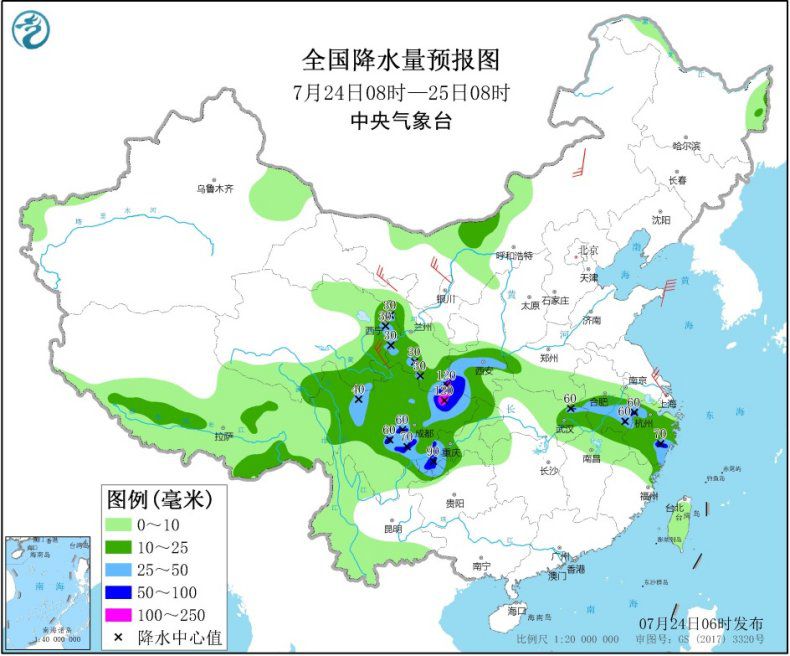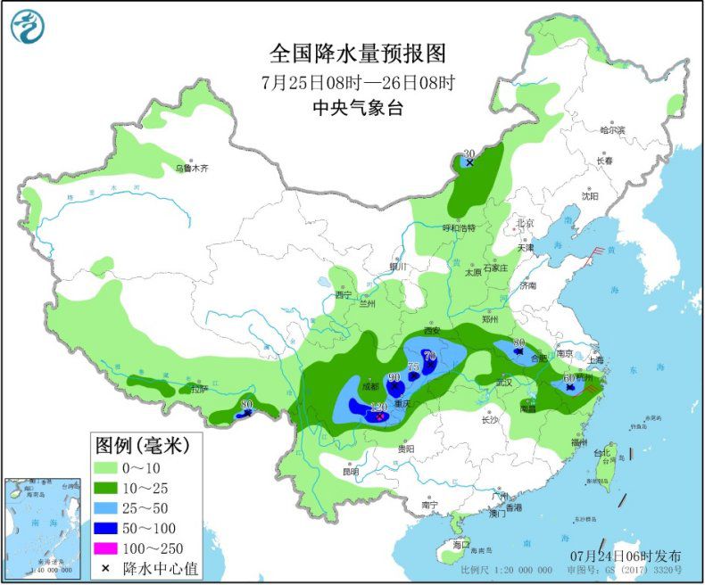 7月24日08时至25日08时,内蒙古西部、西北地区中部和东南部、西南地区北部和东部、江淮西部、江南东部等地部分地区有中到大雨,其中,陕西西南部、四川盆地西北部和南部、安徽东南部、浙江东部、湖北东部等地部分地区有暴雨或大暴雨(100~120毫米)。内蒙古中西部、西北地区中部等地部分地区有4~5级风。