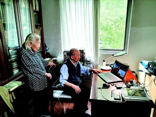 崔崑夫妇在书房一起观看早年演唱俄文歌曲的视频。 本报记者李伟摄