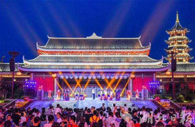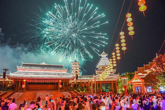 7月25日晚,游客在荆州方特东方神画主题乐园观看夜场演出。为激活暑期旅游市场消费潜力,促进旅游业疫后恢复发展,荆州市各旅游景区在做好常态化疫情防控举措的前提下,针对性地推出多项暑期旅游惠民措施,通过对夜间旅游市场进行重点策划和打造,推出系列主题活动,并延长景区夜间运营时长,吸引游客参观体验。(视界网黄志刚摄)