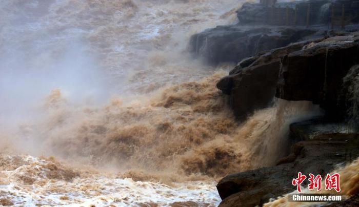 7月21日,晋陕大峡谷的黄河壶口段受黄河中上游降雨和水库调水影响,水流量大增,使得壶口主副瀑布连成一线,游客们在这里欣赏到难得一见的绵延数百米的壮美瀑布群。图片来源:人民视觉