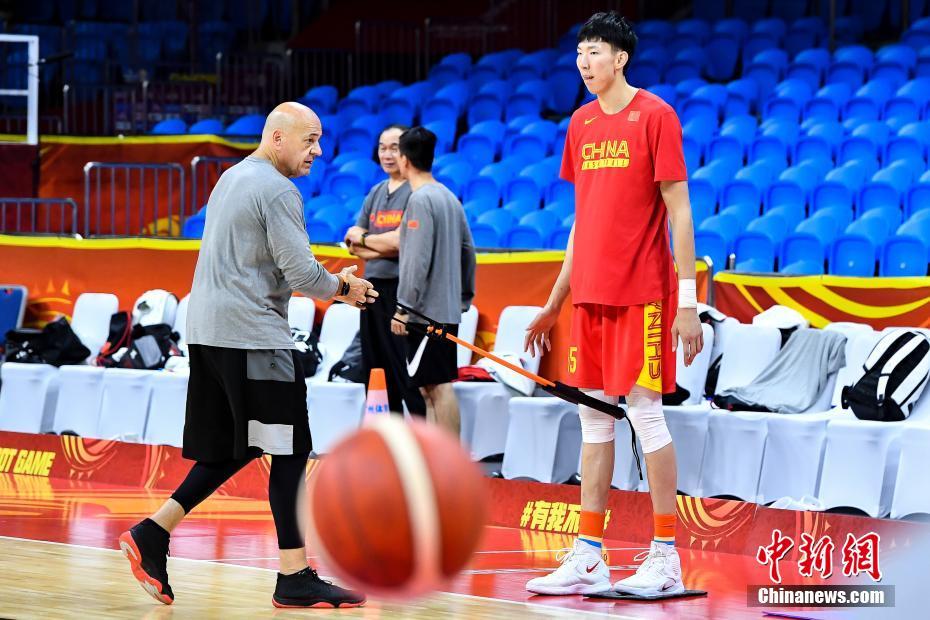 资料图:2019年8月25日,中国男篮在武汉体育中心体育馆进行热身,周琦在场上训练。中新社记者 张畅 摄
