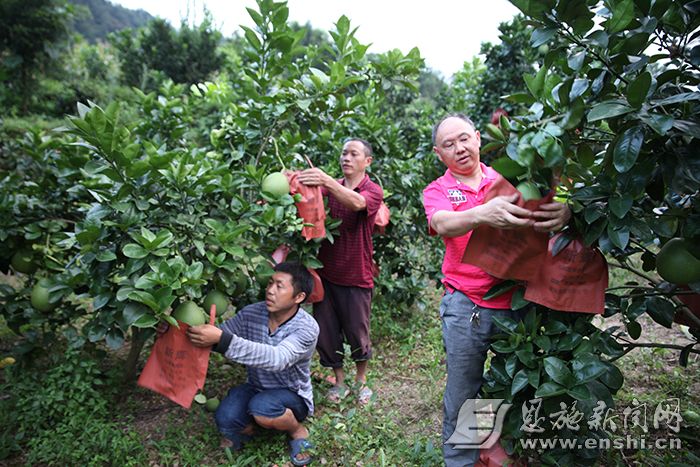 果实套袋生产,可有效降低白柚的病虫害,提高白柚的果品成色和果肉质量。如今,在金果坪乡龙王河白柚专业合作社的推广下,给白柚“套袋穿衣”已成为该乡柚农致富的新“套”路。(恩施图片库 陈祥楚 摄)